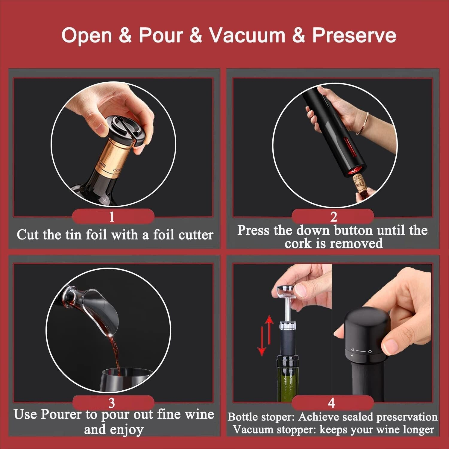 - Dispozitivul de taere a capsulei permite indepartarea capsulei cu usurinta si in siguranta pentru a scoaterea dopului, iar aeratorul este perfect pentru oxigenarea si servirea vinului, sporindu-i aroma.
