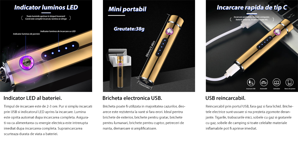 • Reincarcabil prin portul USB, nu necesita gaz si lichid. Brichetele electrice sunt usoare si nu au zgomote enervante. Tigarile, trabucurile mici, aragazele si gratarele cu gaz, sobele de camping si toate celelalte materiale inflamabile pot fi aprinse imediat.